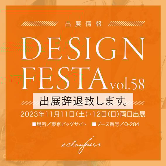 こんにちは。エクランジュールです。 11月11日(土)・12日(日)に出展予定のデザインフェスタ58ですが、 出展辞退させて頂く事となりましたのでお知らせ致します。 楽しみにしていてくださった皆様、エクランジュールの為にもう既にチケットをご購入されていた方々大変申し訳ございません。...