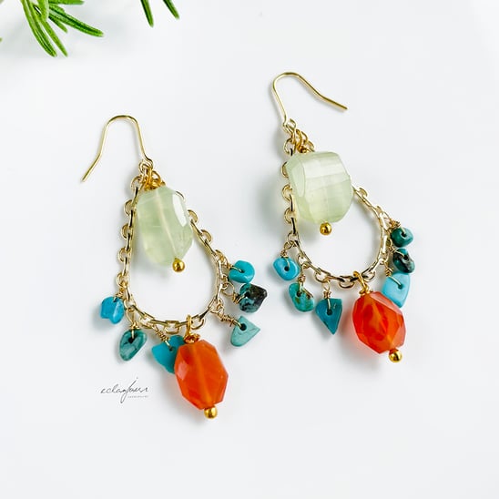 そのチェーンにカーネリアンの朱(あか)と、ターコイズブルー、そして癒やしのプレナイトのグリーンの天然石たちを丁寧にくくりつけてあります。