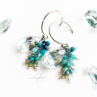 グリーンアメジストの14kgfピアスです。1.7mm〜2.5mmのターコイズ・ペリドット・グリーンクォーツ・カルセドニーをワイヤーで括り付けた房を添え、繊細で美しいピアスに仕上げました。