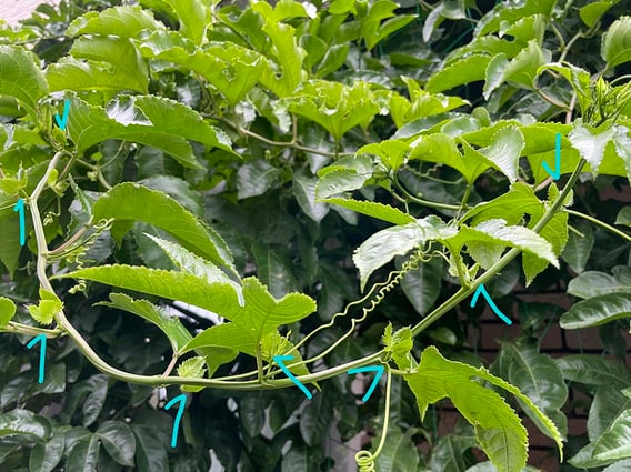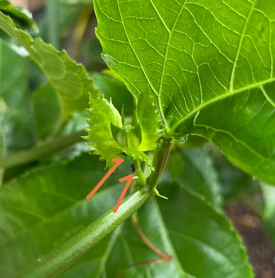 よく見ると、パッションフルーツの茎から分泌される甘い蜜に誘われて蟻さんも来てますね。