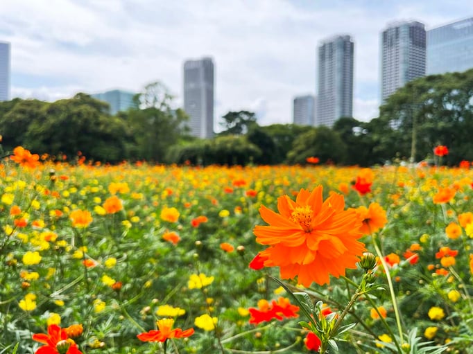 公園の向こうに巨大なビルが見えるのは大都市ならではの光景。