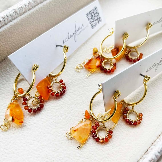 カーネリアン、ヘソナイト、ダイドオパールの美しい朱コーデなピアスです。