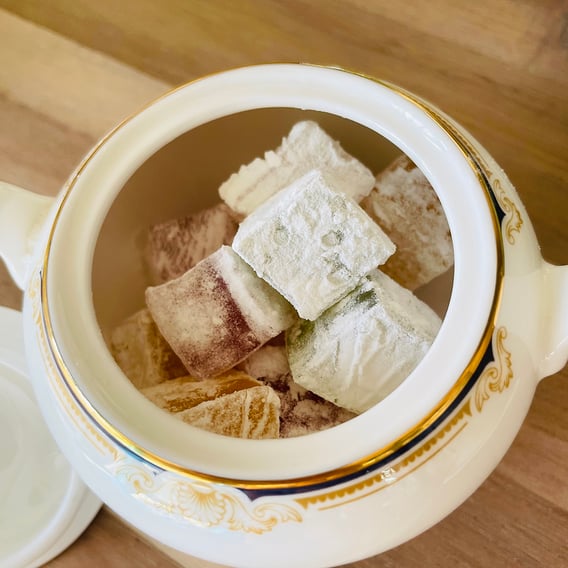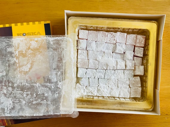 トルコの伝統的なお菓子「ロクム(lokum)」は、砂糖とデンプンをベースに、ピスタチオやヘーゼルナッツなどを加えて作られます。