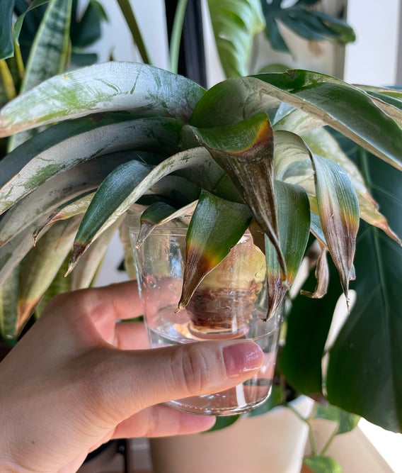 葉っぱも何枚か剥いて茎部分の面積を確保し、お水をいれたコップに挿しておきました。
