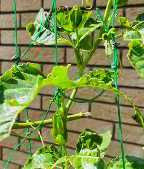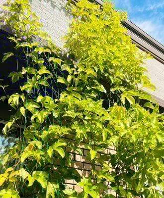 2Fのベランダからつる植物用のグリーンネットを垂らし、適当につるを引っ掛けてスタンバイOKです。