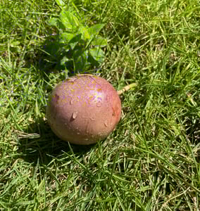 朝の水やりで葉っぱの影でひっそりと下部から色付き始めたパッションフルーツを発見!