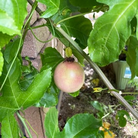 専門家からのアドバイスによると秋に開花→結実したものは、日照不足と気温不足で万が一冬が来る前に赤くなったとしても、味や香りの薄いまずいパッションフルーツにしかならない。更に秋に沢山実をつけると翌年の春に花芽が付きにくくなるとのことでしたので、今年は一切受粉作業せず花の開花を楽しんでいましたが、一個だけ虫のおかげか風のおかげが自然に結実したものがありました。
