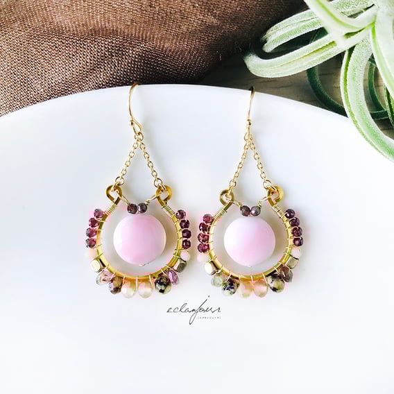 ピンク色はクイーンコンクシェル、ワインレッドはガーネット、グリーンからピンクへのグラデの入っているトルマリンなど、天然石の色味を上手に利用してる自分の作品を改めてマジマジと観察・研究してしまいました。