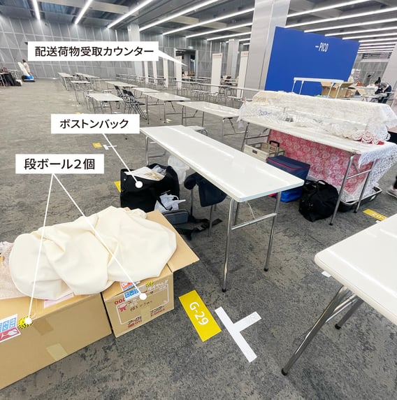 会場到着後、自分のブース番号にレンタルした机とイスが設置されているのを確認して荷物を置き、