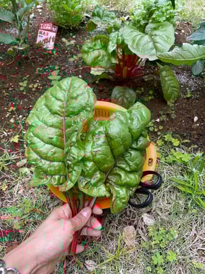 左:スイスチャードは少量ずつ収穫してサラダの彩りに。