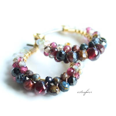 ジューシーで甘酸っぱいベリータルトの上の輝くジュレをまとった宝石さながらのフルーツベリーをイメージして制作したピアスです。美しいワインレッドのガーネットと、ブラウンにブルーが入り混じったピーターサイト等をミックスし、秋らしいしっとりと落ち着いた印象のピアスに仕上げました。