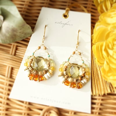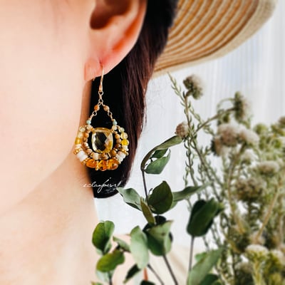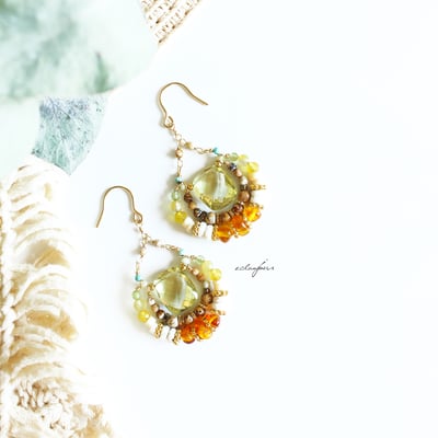 大粒のレモンクオーツを使ったエネルギッシュなイエローピアスです。