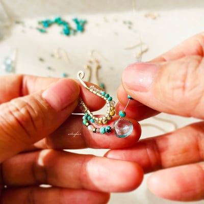 エクランジュールのアクセサリーは色々な色が入るので、ブルーのワンポイントターコイズは勿論の事、